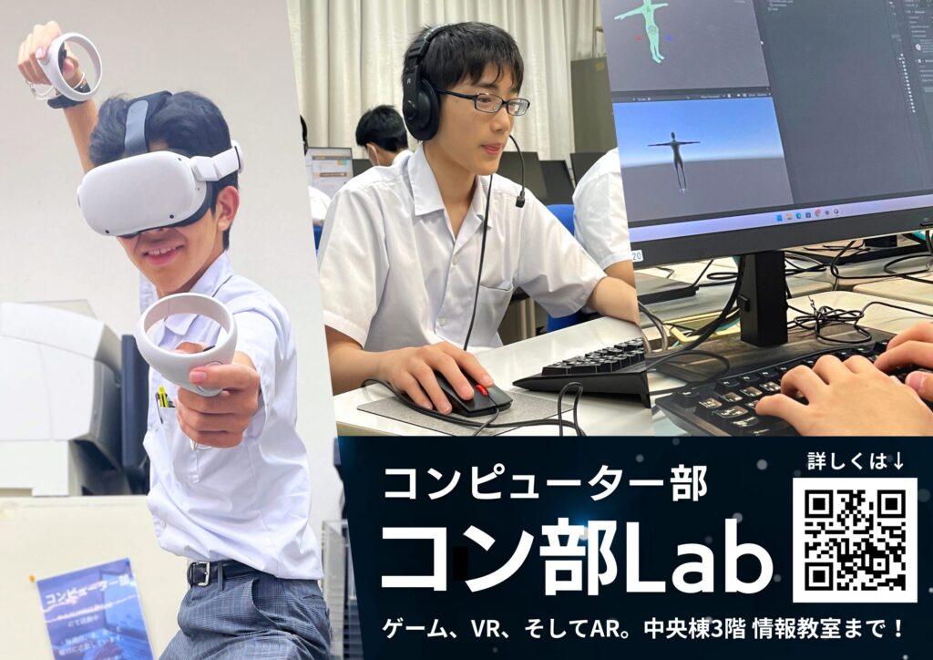 コンピューター部、通称「コン部」は、ゲーム制作や3Dモデル製作をはじめ、動画編集や音楽制作など、幅広く活動しています。